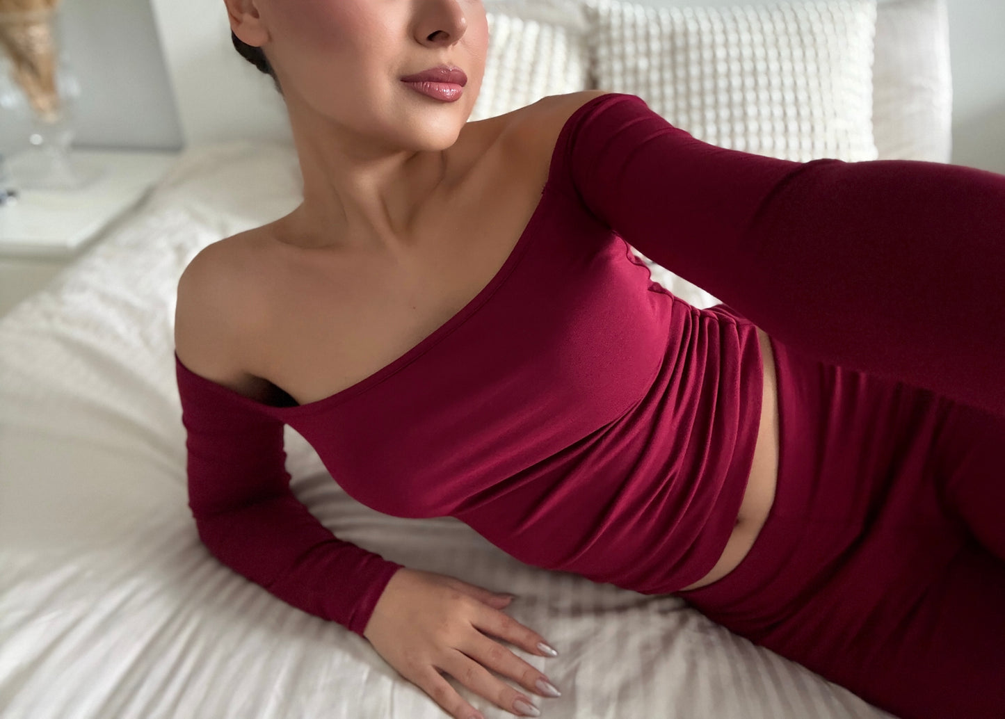 SERENE - ASİMETRİK TEK OMUZ DETAY T-SHIRT - RED PLUM
