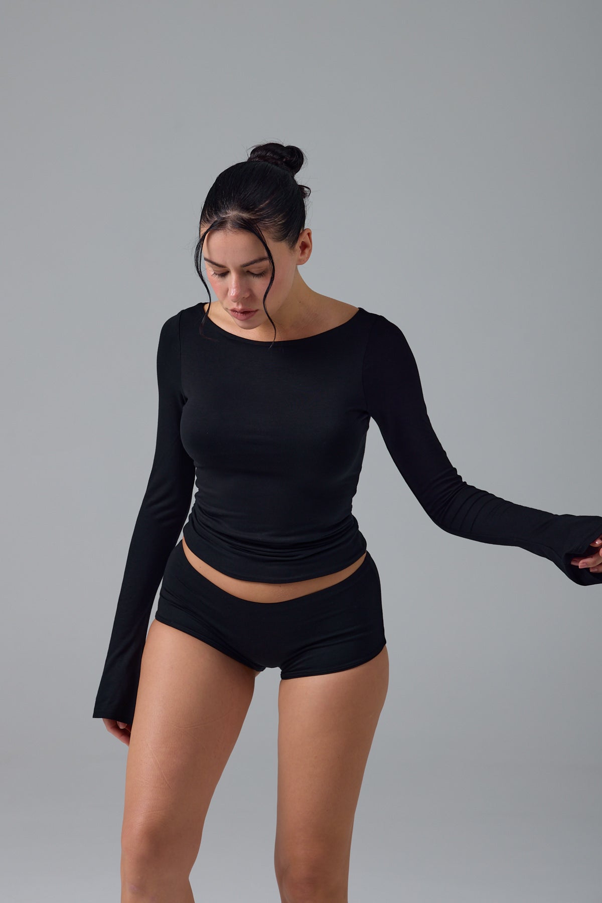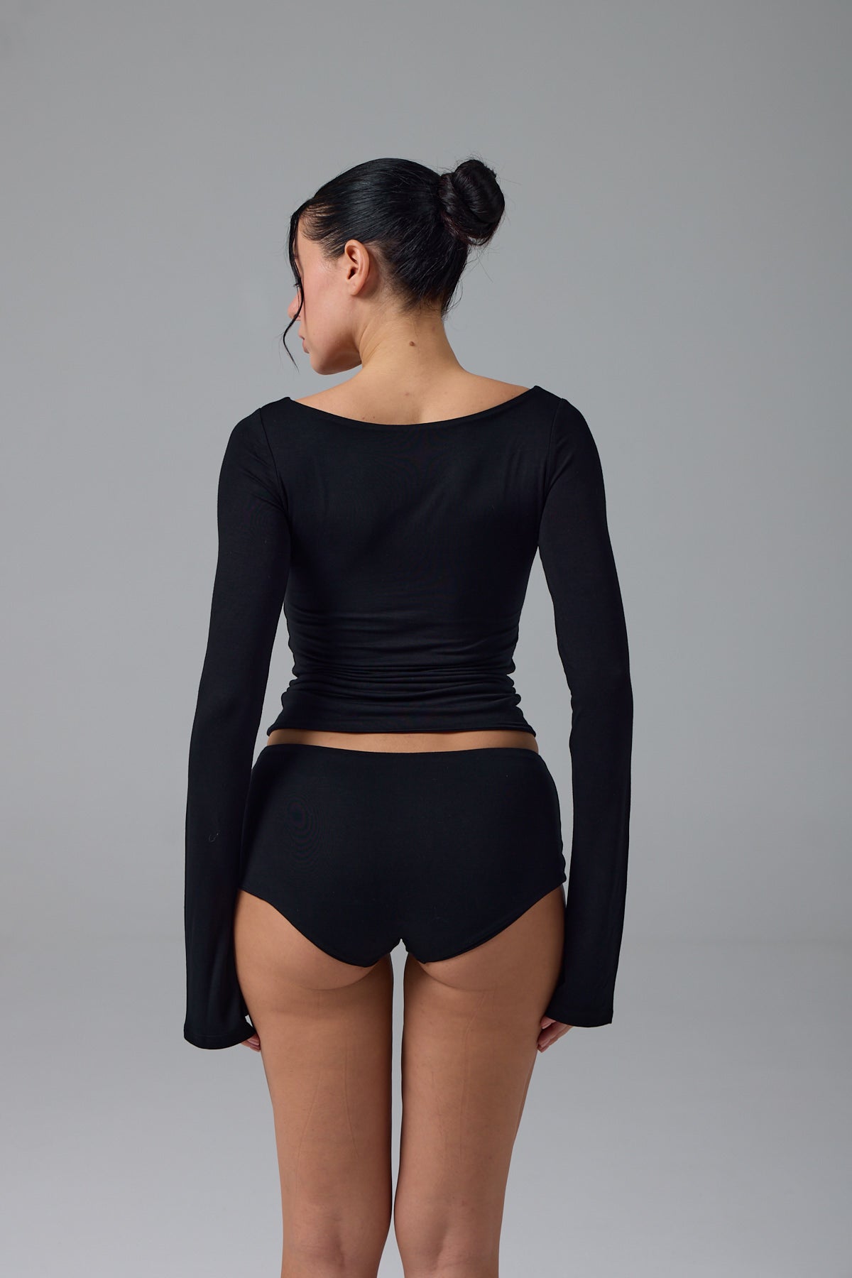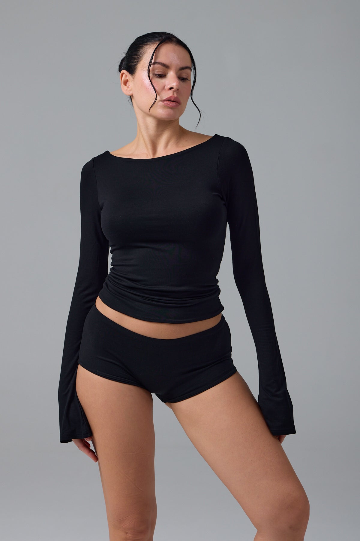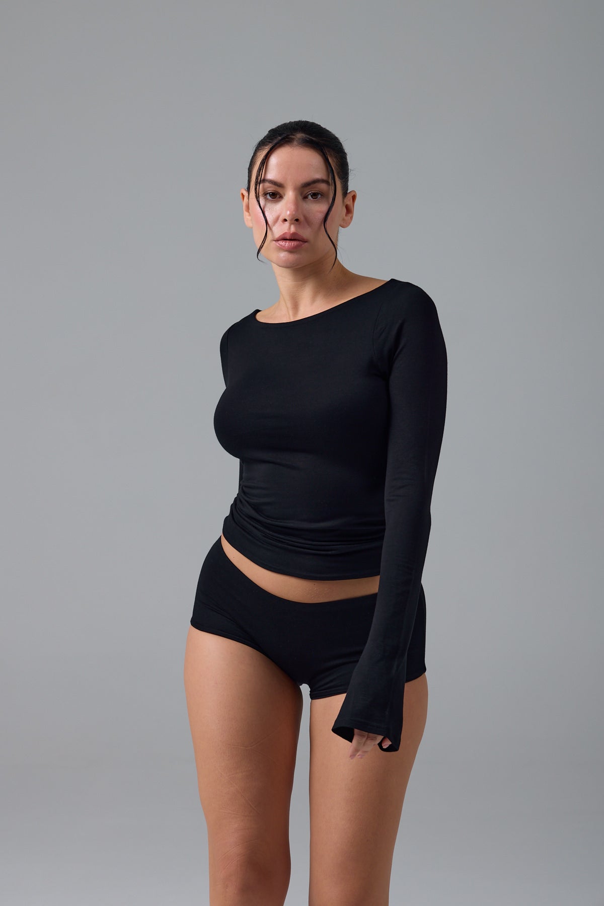 Zamansız zarafetin en sade yorumu. Hoflich, kayık yaka tasarımıyla boyun hattını zarifçe ortaya çıkarırken, akıcı biçimde genişleyen flare kollarıyla siluete dengeli bir hareket kazandırır. Tamamen çift katmanlı yapısı sayesinde iç göstermez bir görünüm sunar; pürüzsüz dokusu ve vücuda sarılan formu ile konforu estetikle birleştirir. Günün her anında kusursuz bir duruş için tasarlandı.